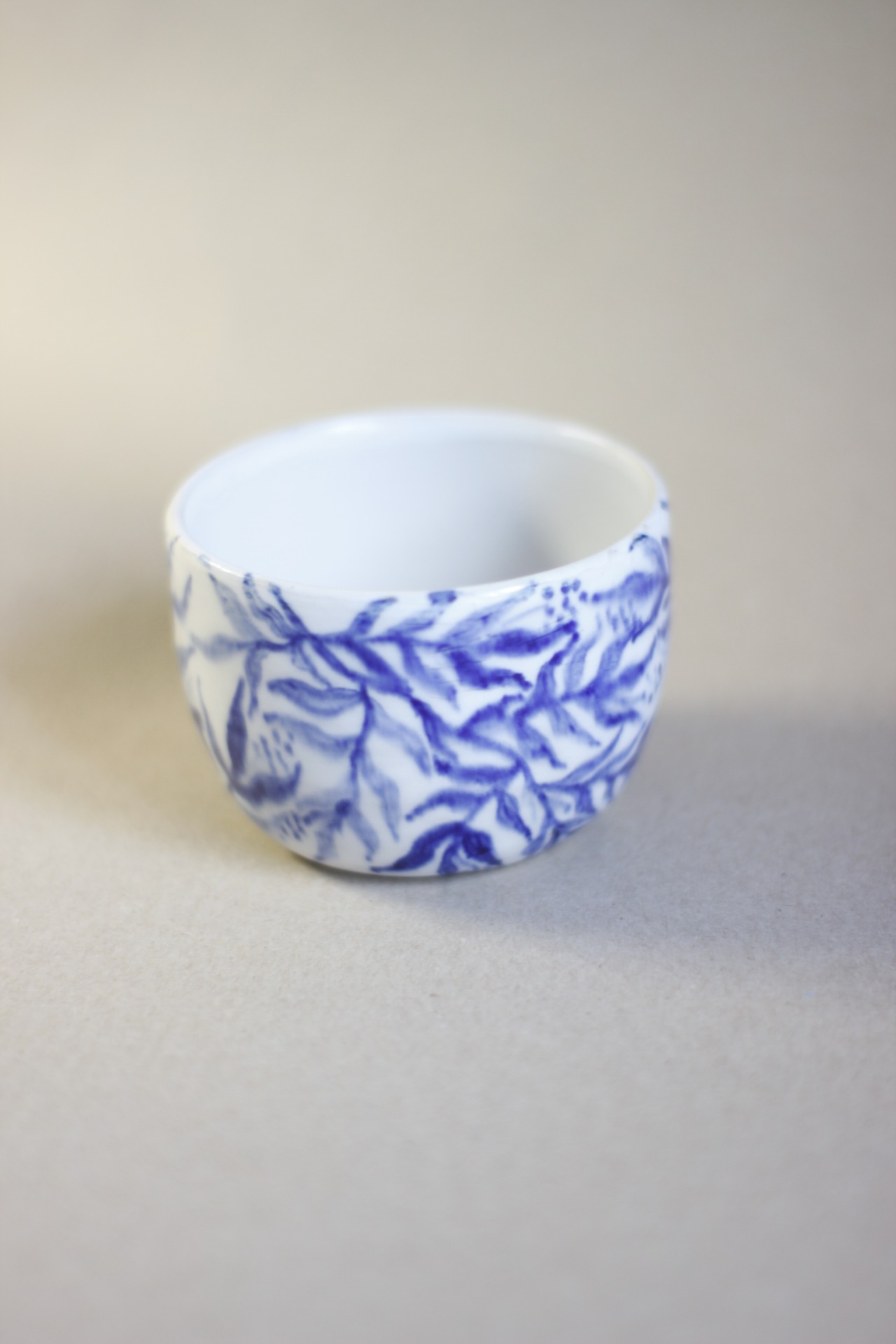 Ručně točený kalíšek ze světlé hlíny . Páleno na vysokou teplotu. Zvládne sem tam myčku, ale raději má mytí v ruce. Výška 5 cm šířka 7,5 cm Objem 160 ml