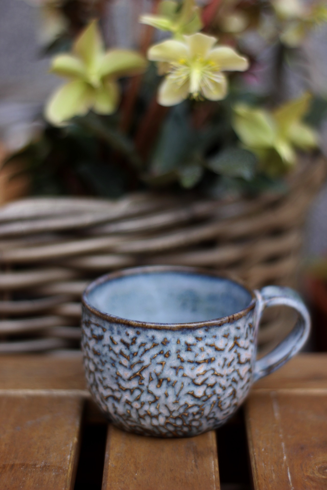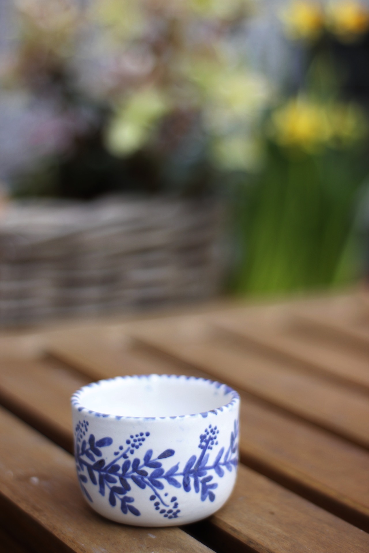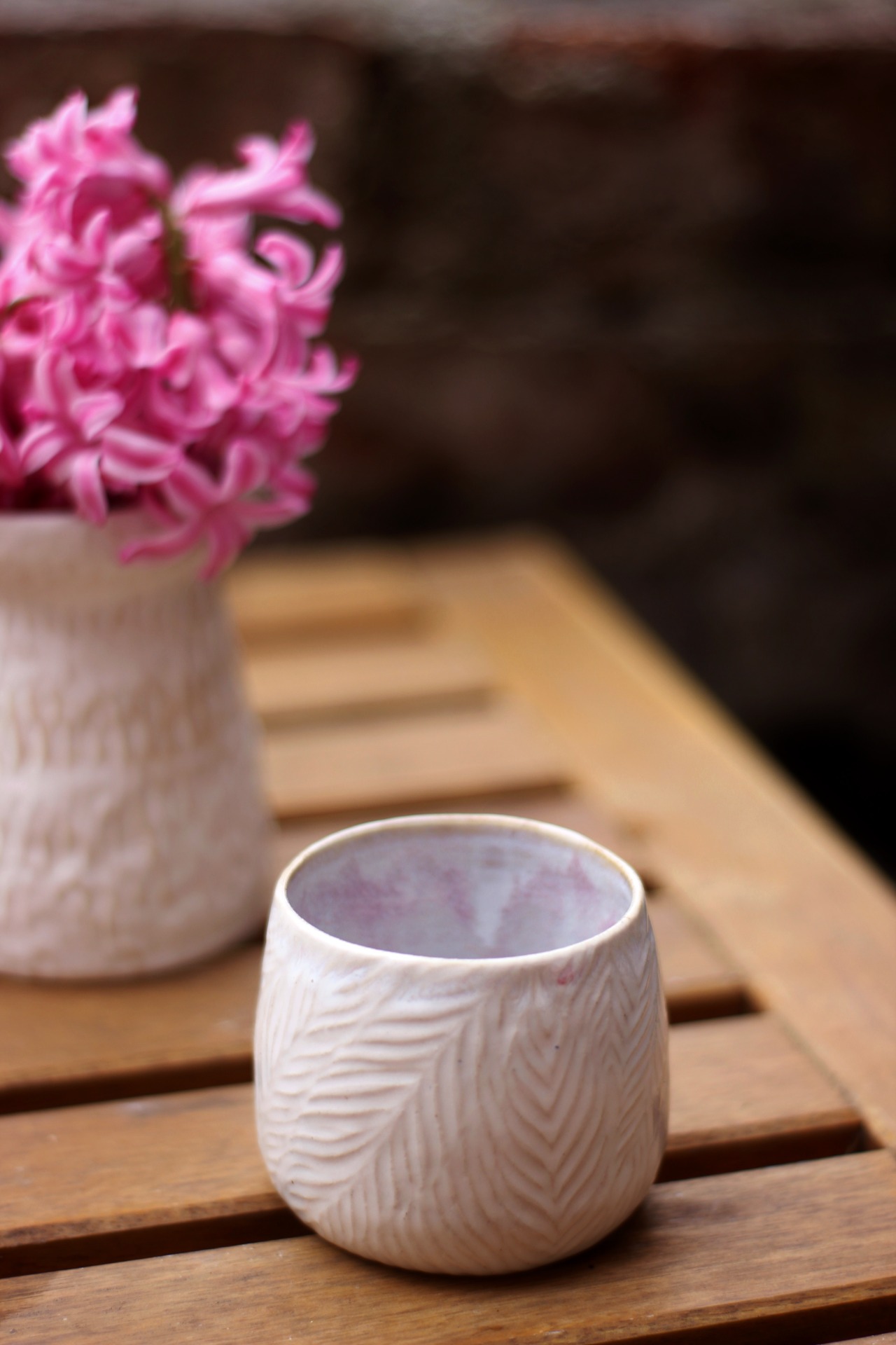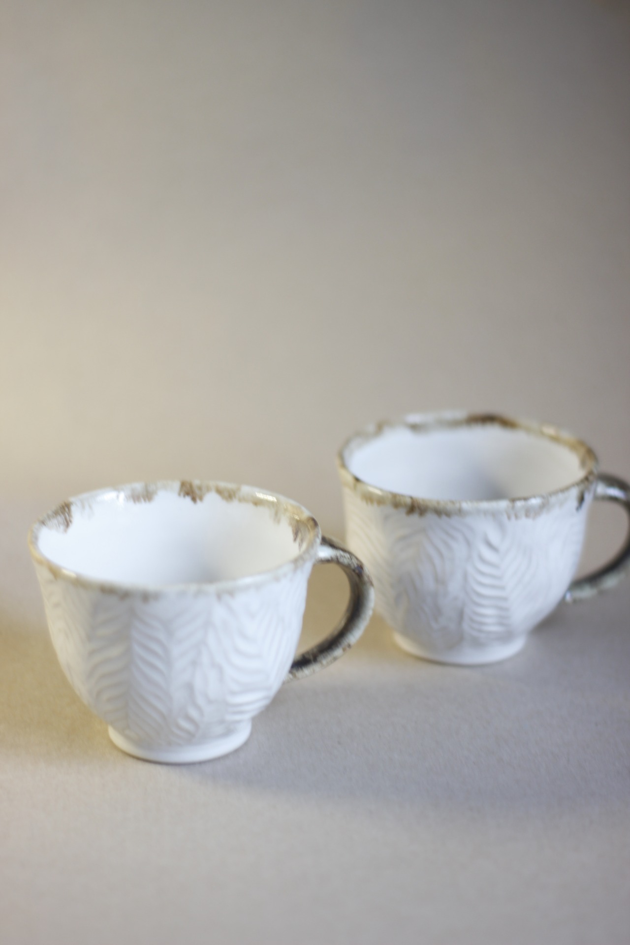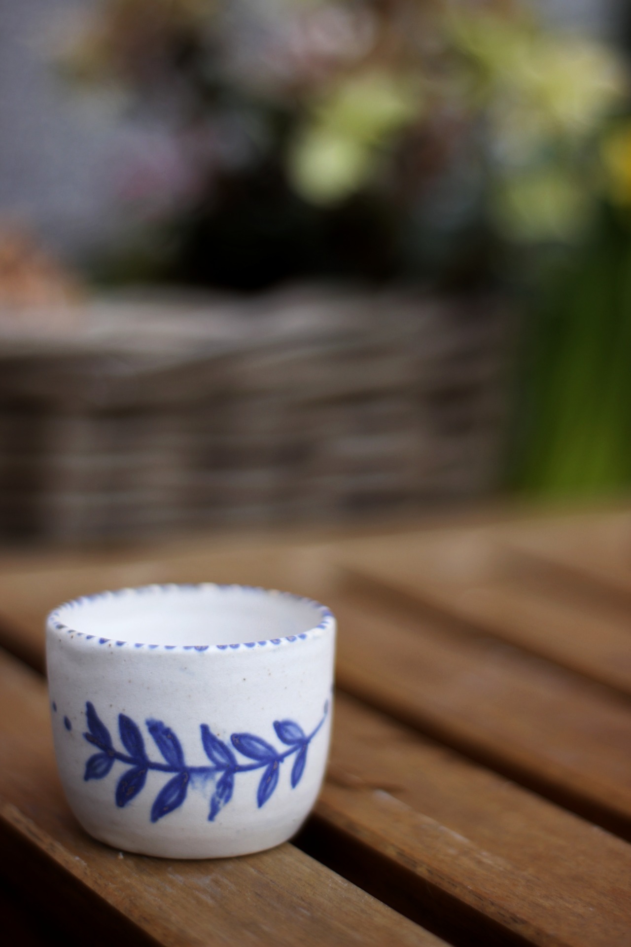 Ručně točené hrnečky ze světlé hlíny . Páleno na vysokou teplotu. Zvládne sem tam myčku, ale raději má mytí v ruce. Výška 6 cm Šířka 7,5 cm Objem 140 ml