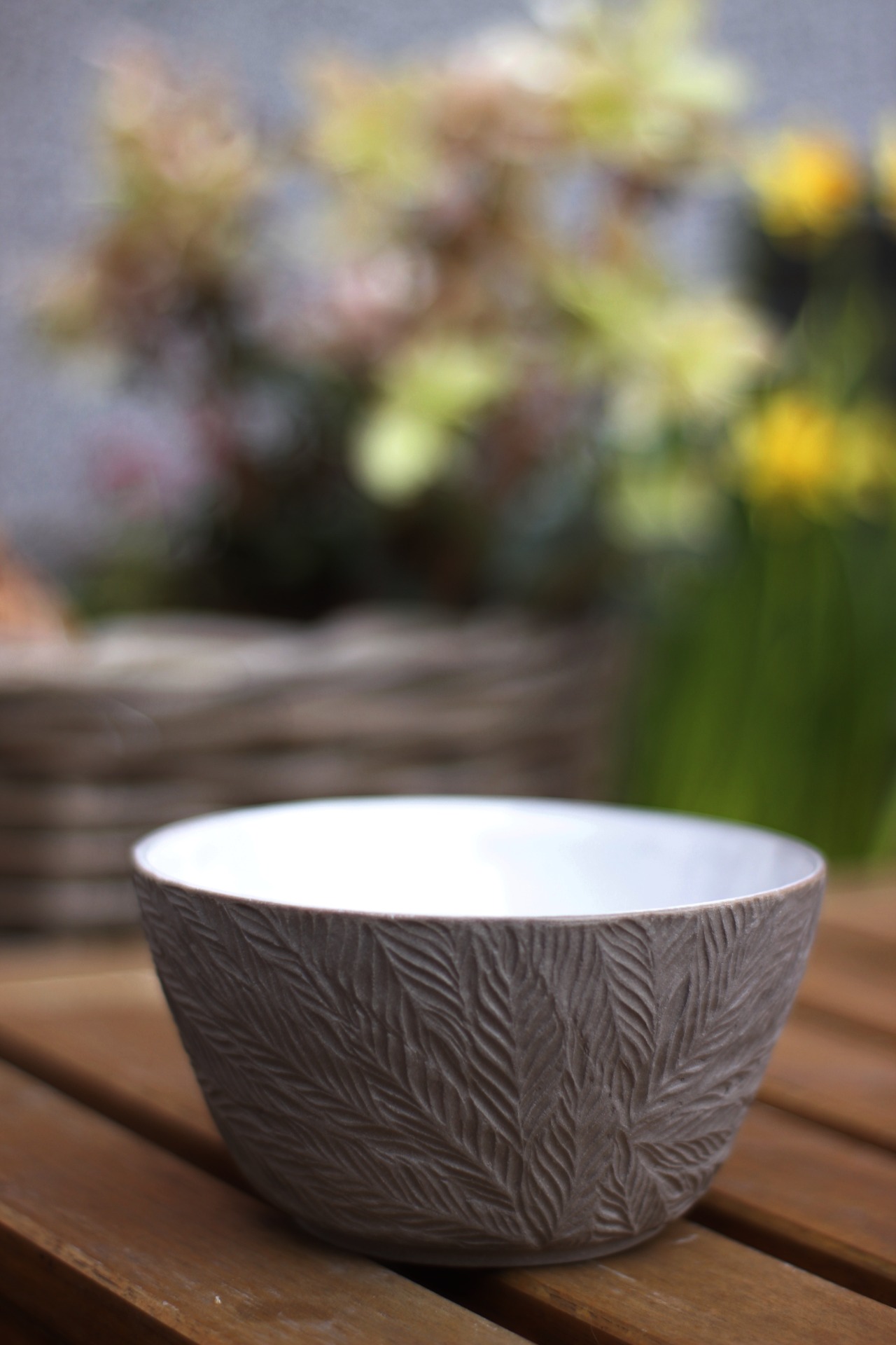 Ručně točený talířek s vyšším okrajem ztmavé hlíny s efektem kávového lógru. Páleno na vysokou teplotu. Zvládne sem tam myčku, ale raději má mytí v ruce. Šířka 21 cm