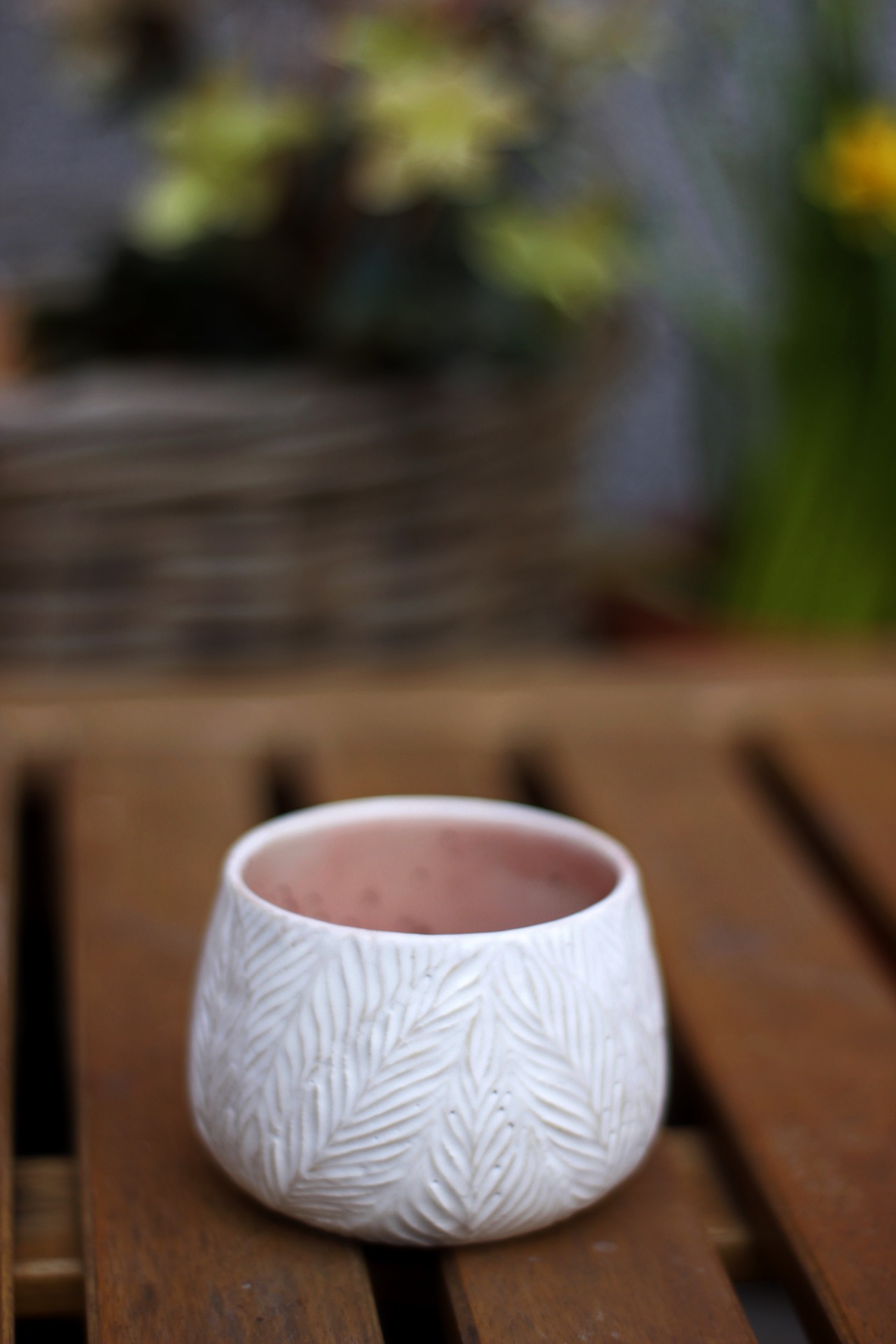 Ručně točený kalíšek ze světlé hlíny . Páleno na vysokou teplotu. Zvládne sem tam myčku, ale raději má mytí v ruce. Výška 5,5 cm šířka 7,5 cm Objem 150 ml
