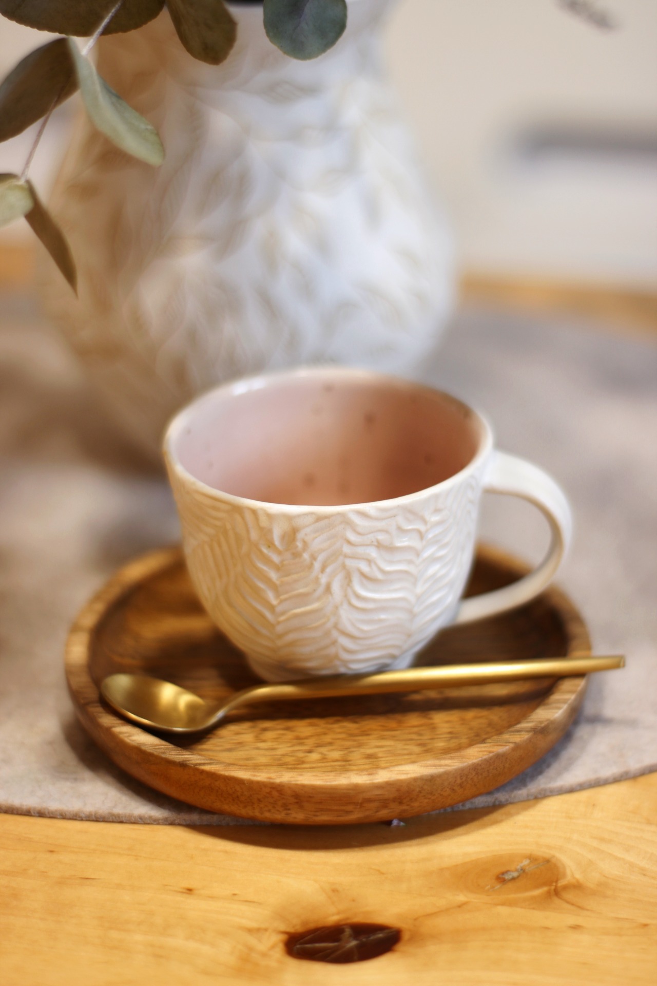 Ručně točené hrnečky ze světlé hlíny . Páleno na vysokou teplotu. Zvládne sem tam myčku, ale raději má mytí v ruce.