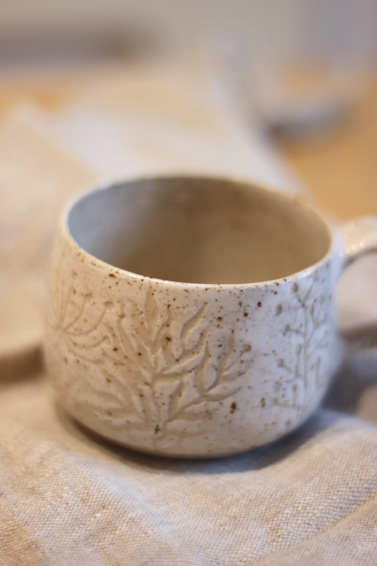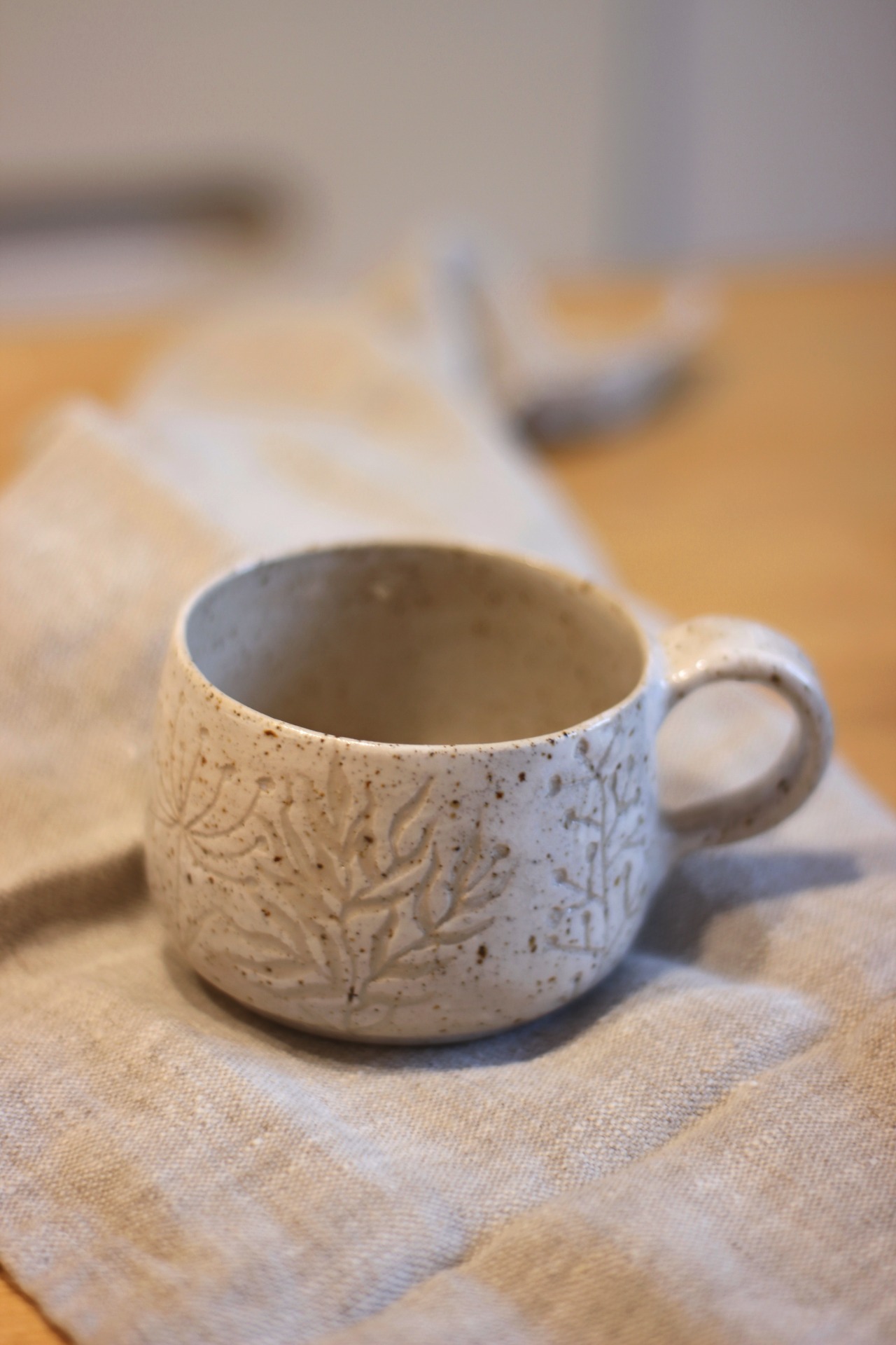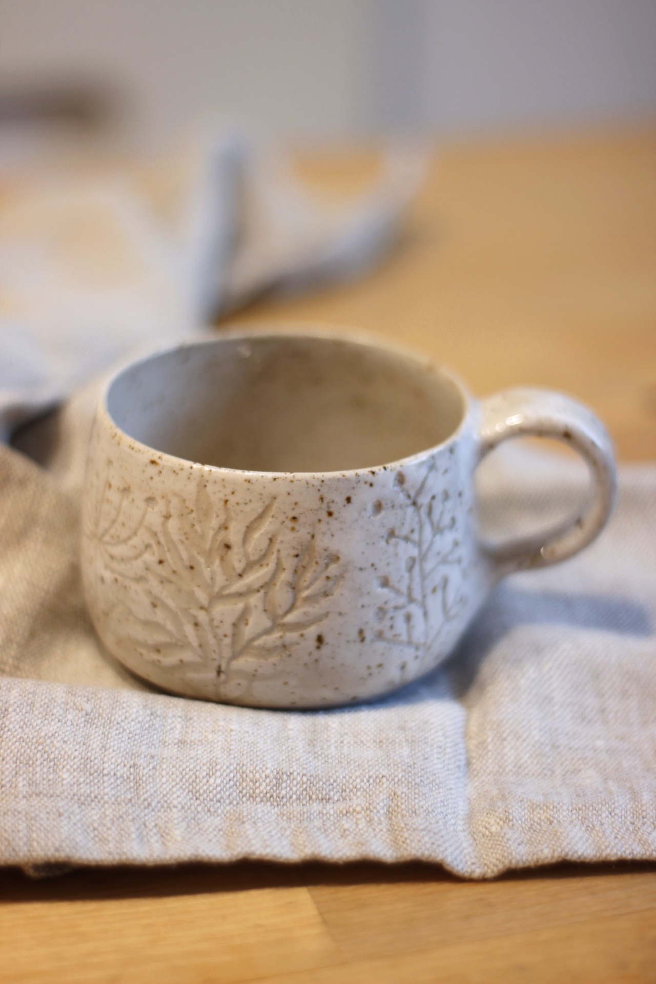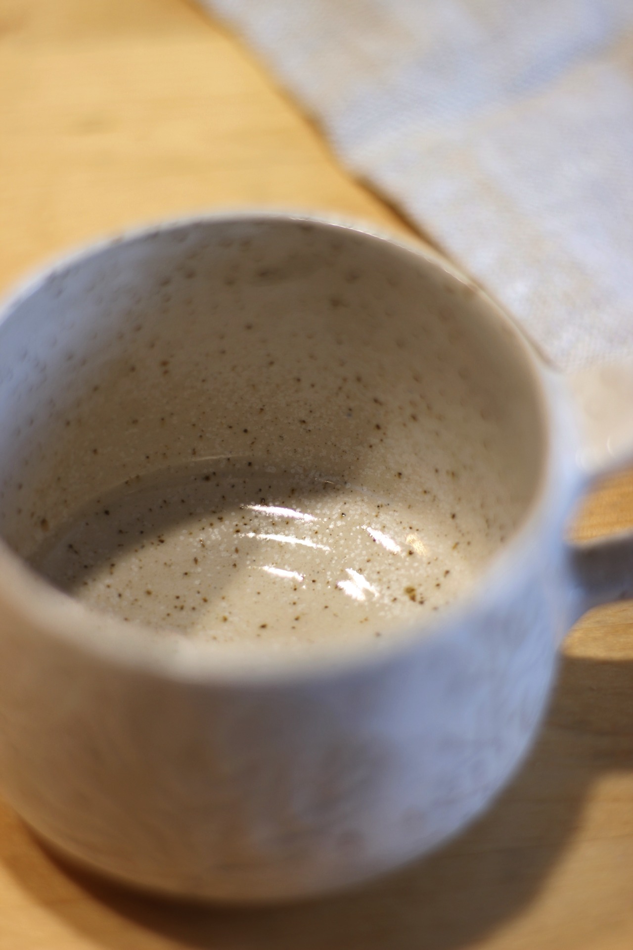 Ručně točený hrneček ze světlé hlíny . Páleno na vysokou teplotu. Zvládne sem tam myčku, ale raději má mytí v ruce.