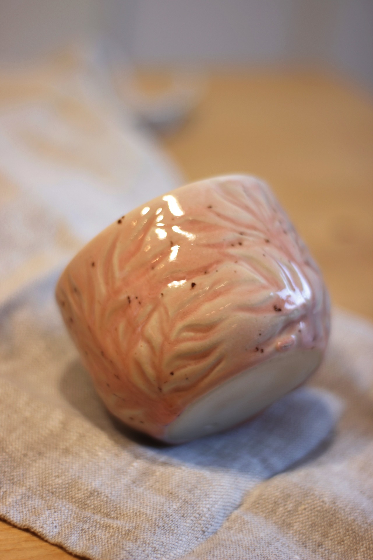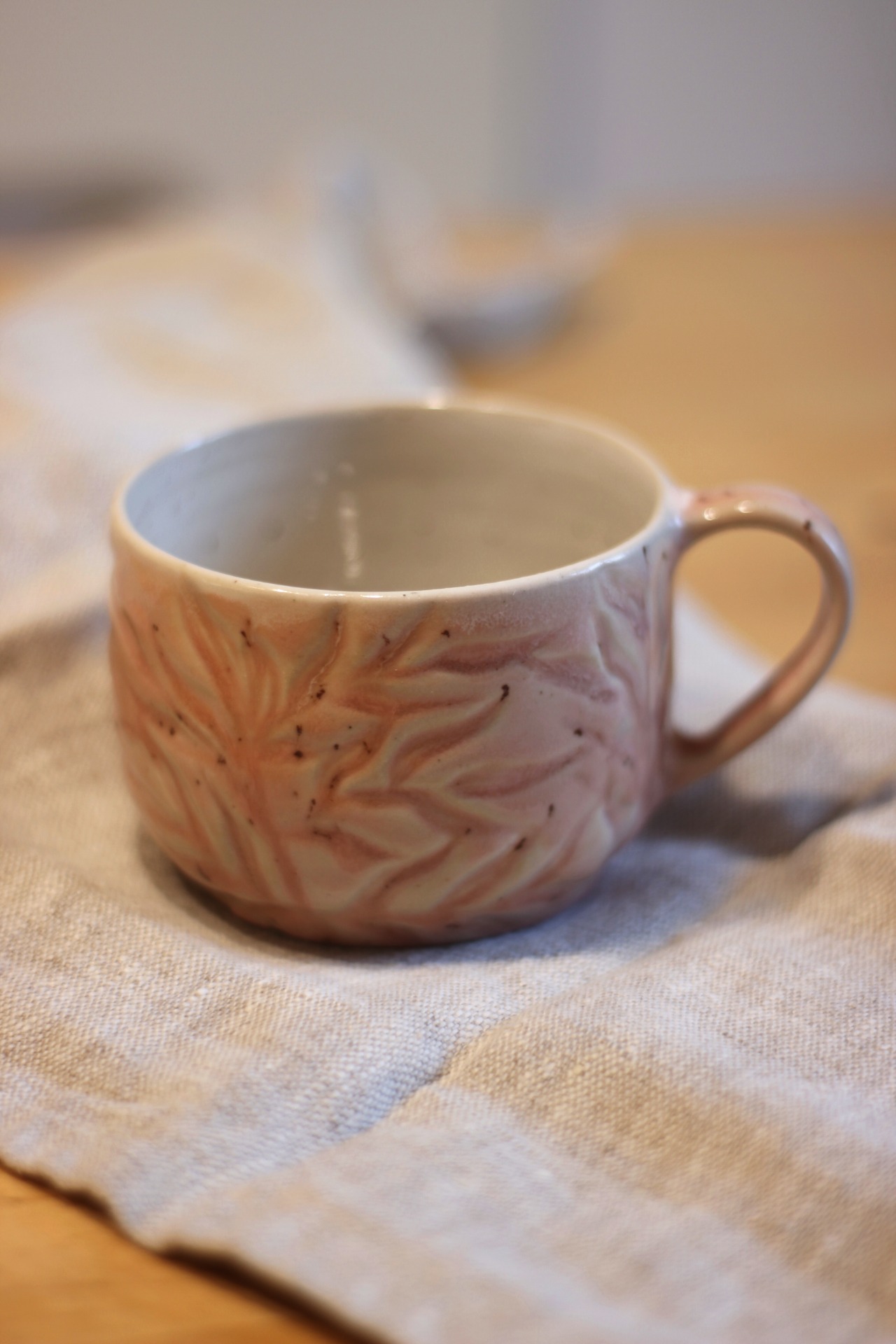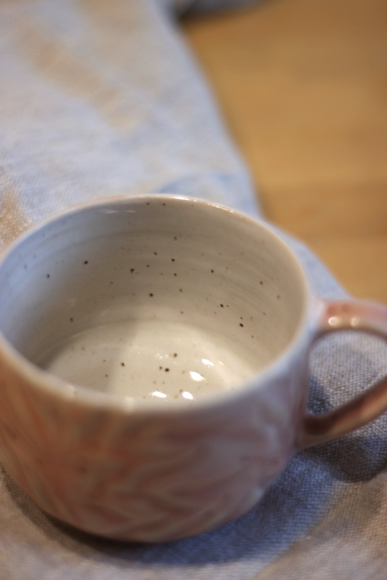 Ručně točený hrneček ze světlé hlíny . Páleno na vysokou teplotu. Zvládne sem tam myčku, ale raději má mytí v ruce.