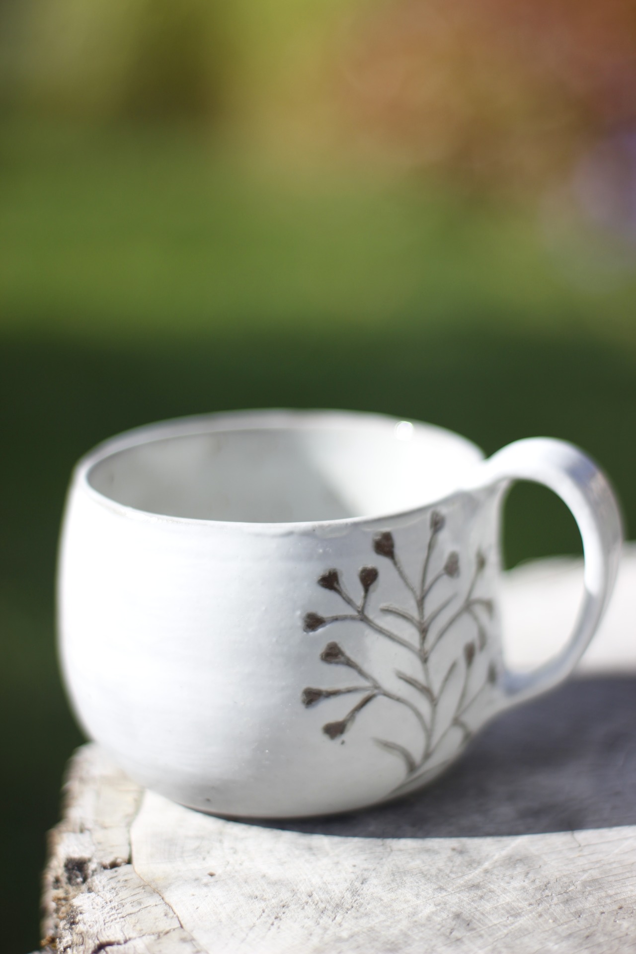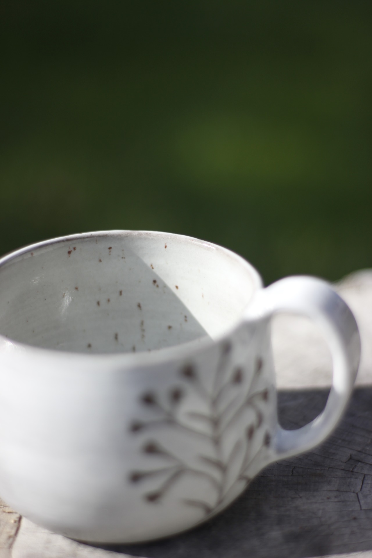 Ručně točený hrneček ze světlé hlíny s efektem kávového lógru. Páleno na vysokou teplotu. Zvládne sem tam myčku, ale raději má mytí v ruce.