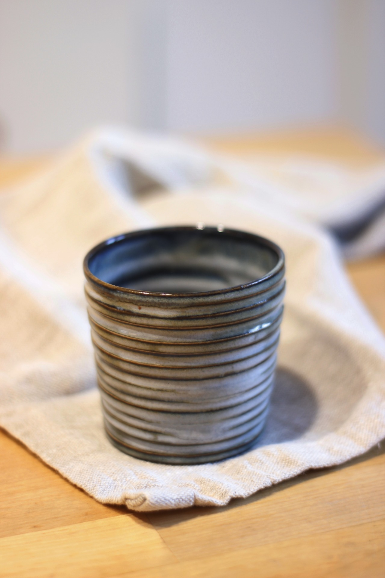 Ručně točený kalíšek ze světlé hlíny . Páleno na vysokou teplotu. Zvládne sem tam myčku, ale raději má mytí v ruce.
