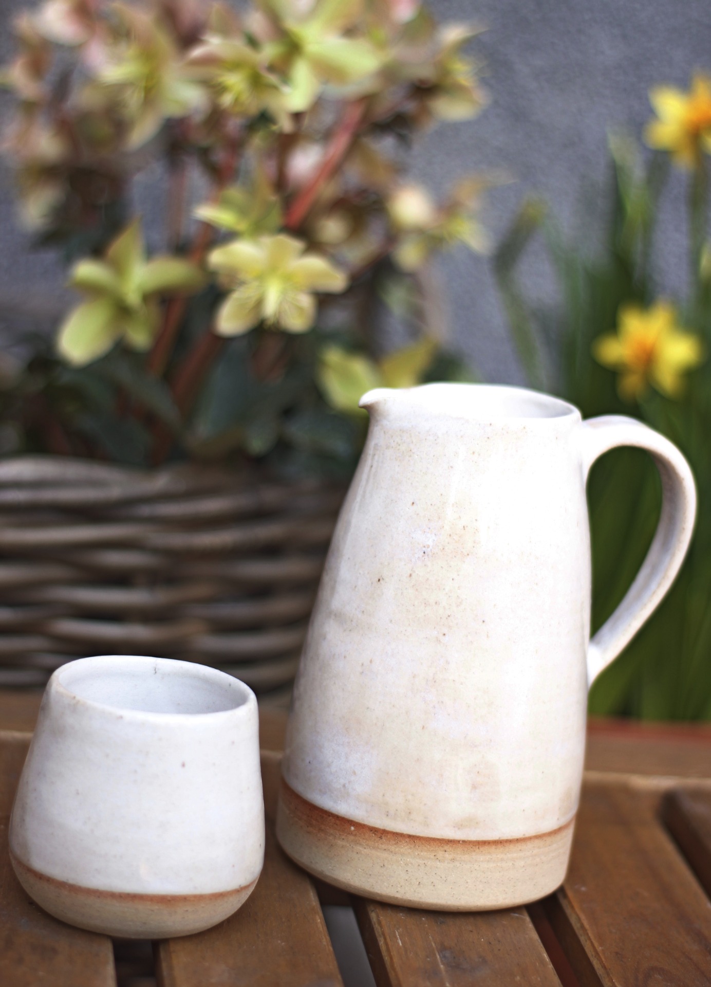 Ručně točená konvička ze světlé hlíny. Páleno na vysokou teplotu. Zvládne sem tam myčku, ale raději má mytí v ruce.