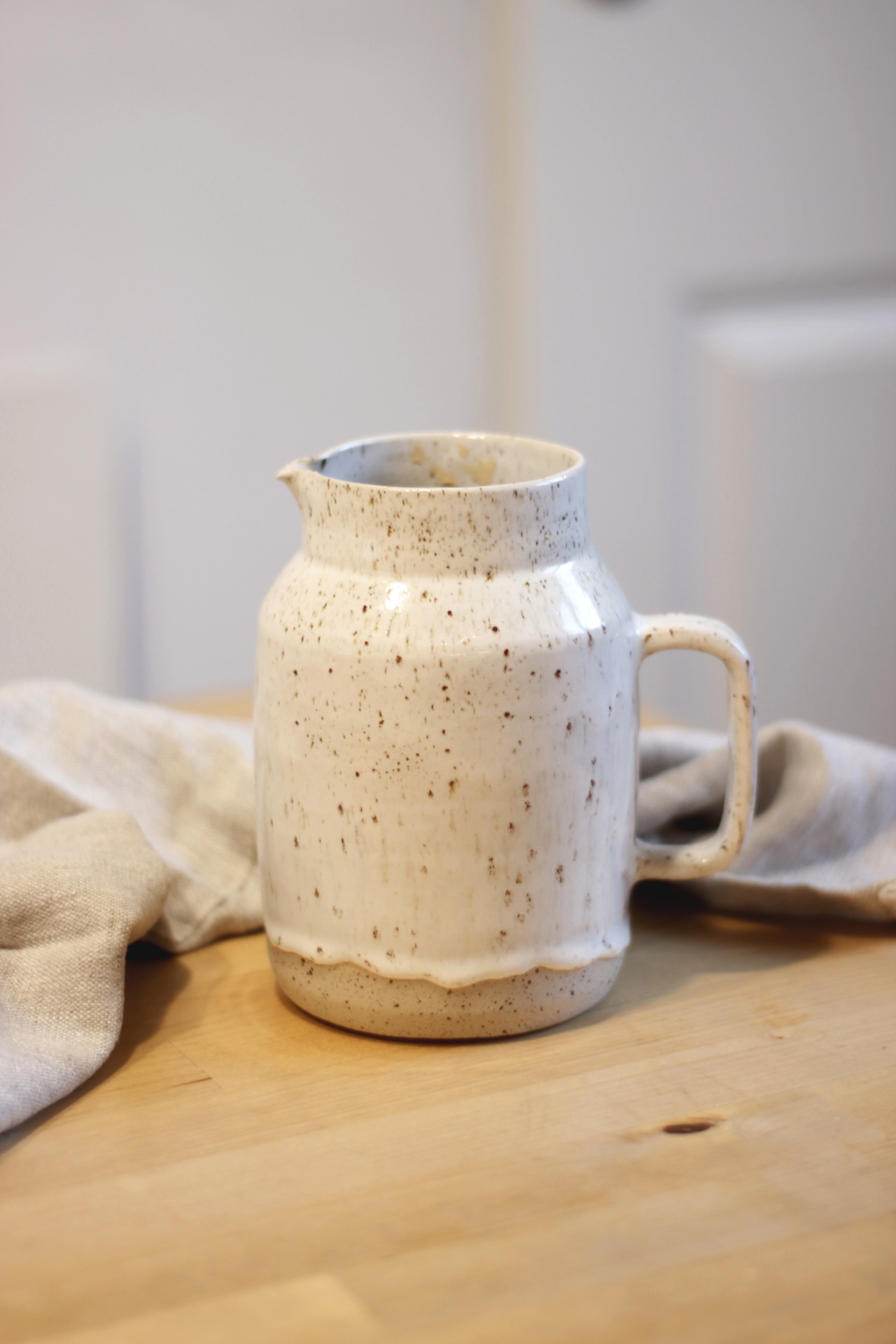 Ručně točená konvička ze světlé hlíny. Páleno na vysokou teplotu. Zvládne sem tam myčku, ale raději má mytí v ruce.