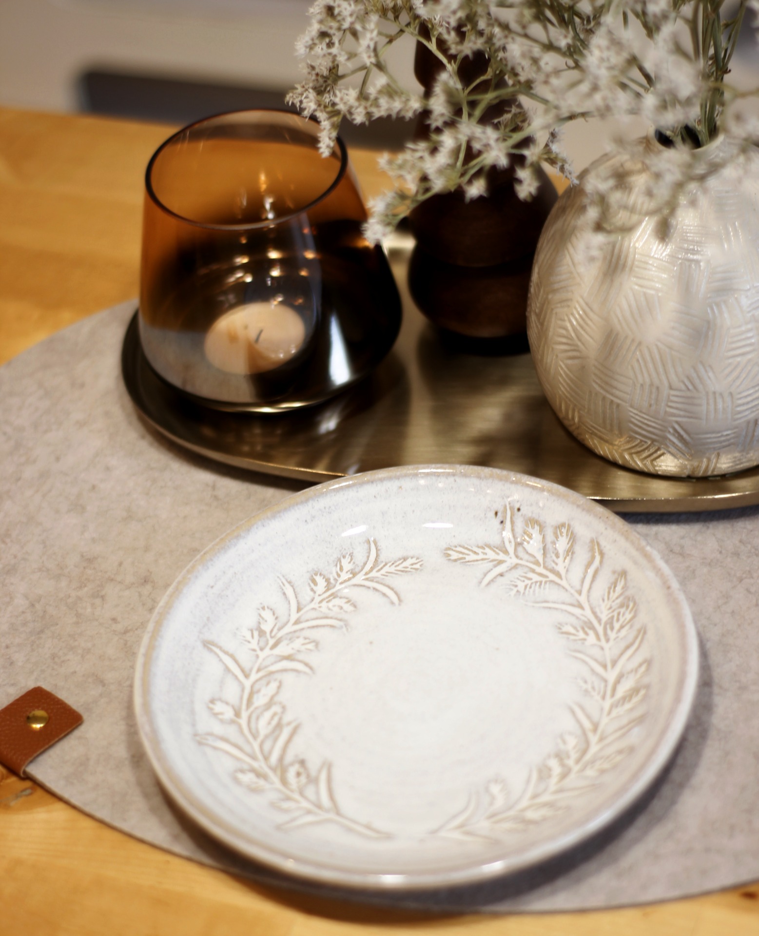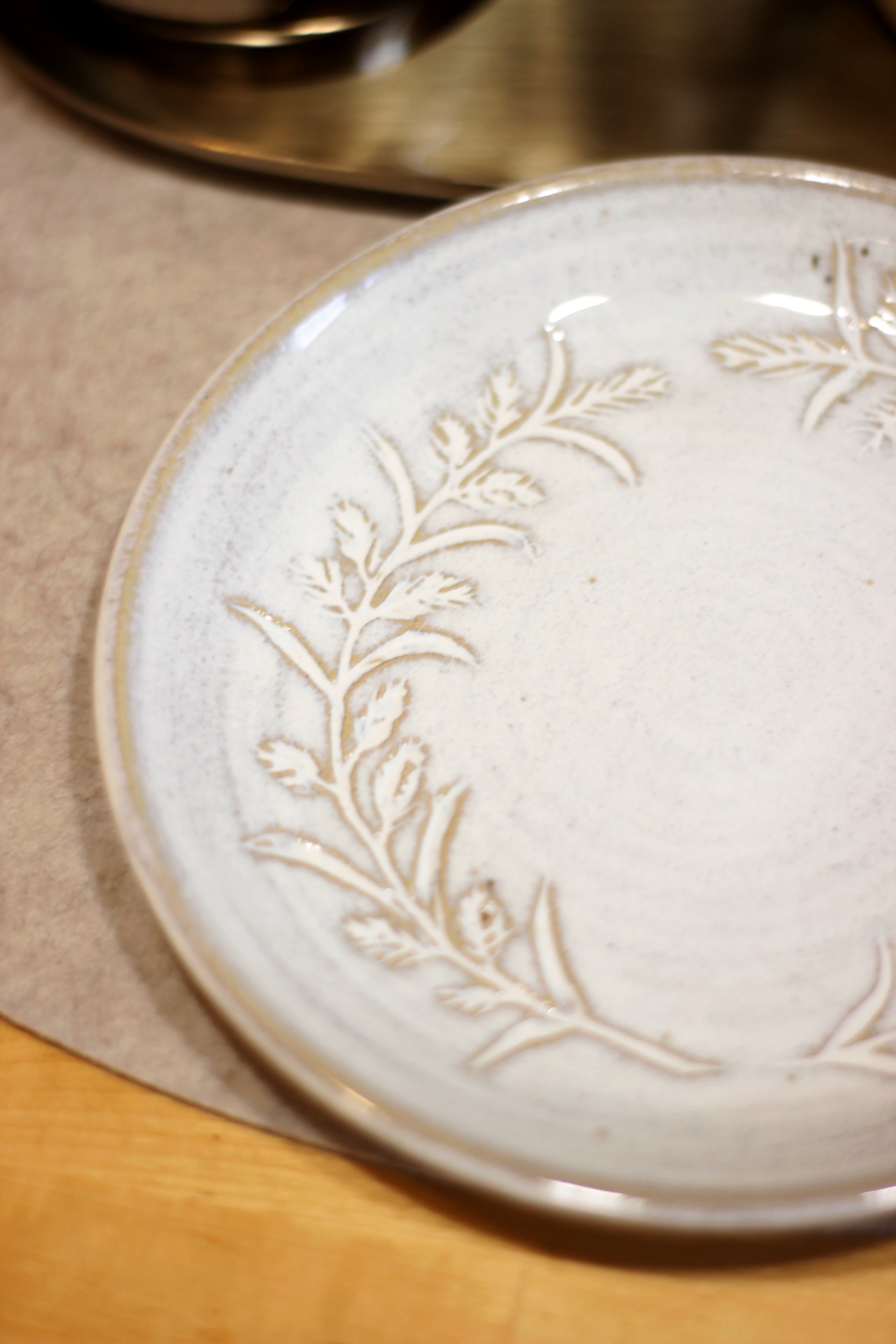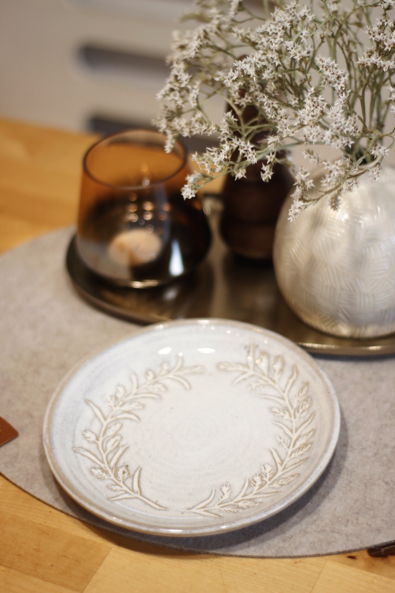 Ručně točený talířek ze světlé hlíny . Páleno na vysokou teplotu. Zvládne sem tam myčku, ale raději má mytí v ruce.