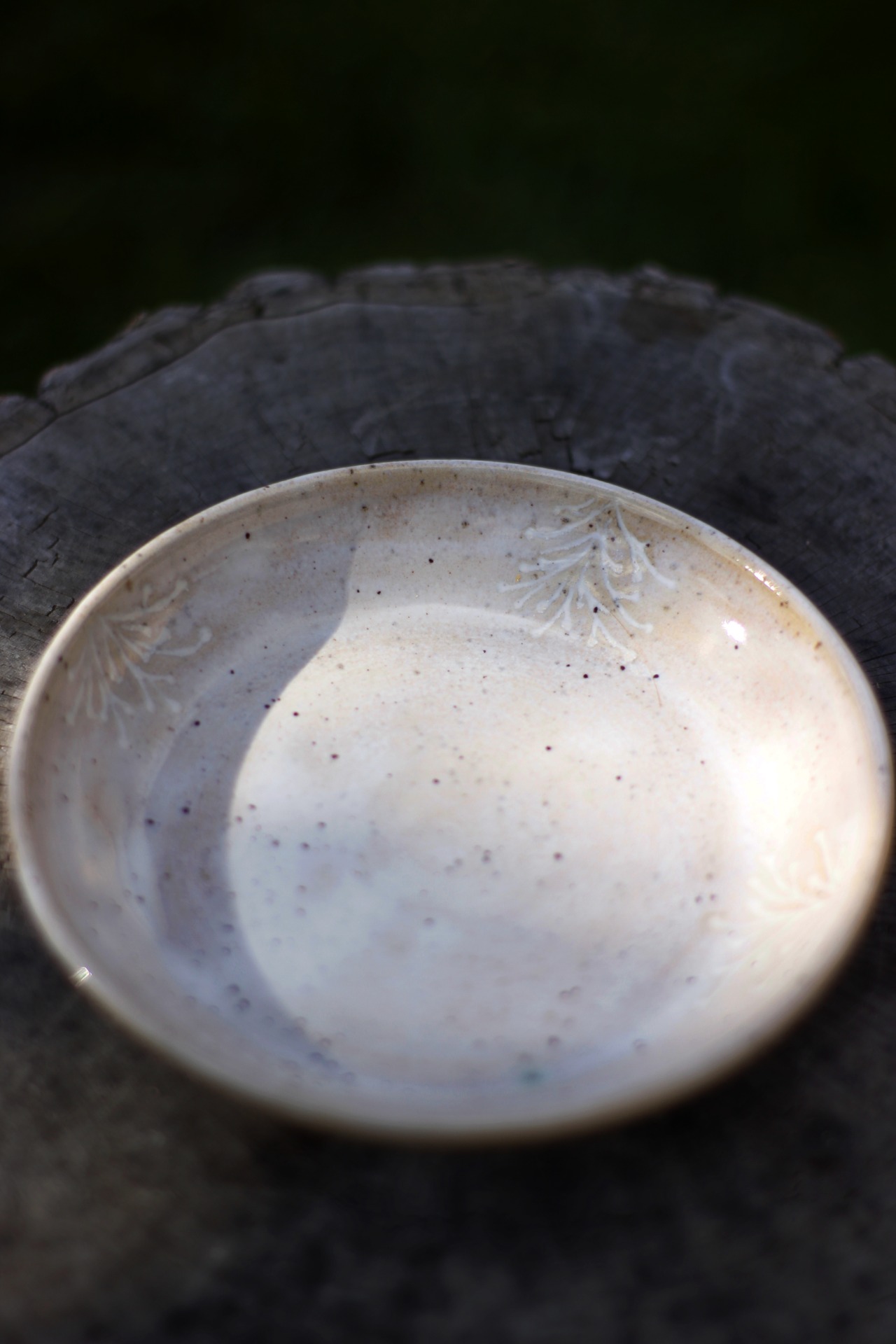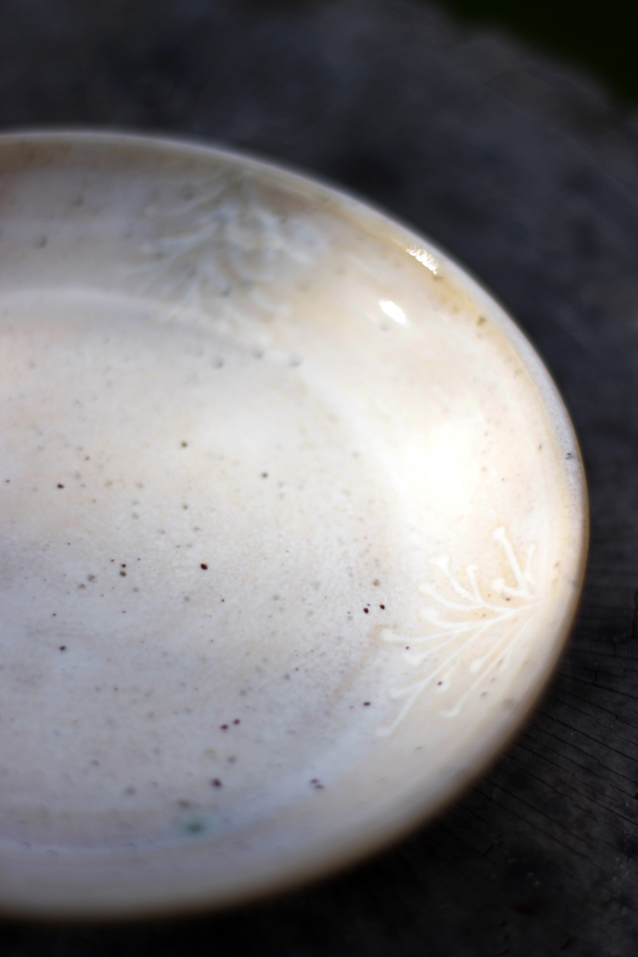 Ručně točený talířek ze světlé hlíny s efektem kávového lógru. Páleno na vysokou teplotu. Zvládne sem tam myčku, ale raději má mytí v ruce.