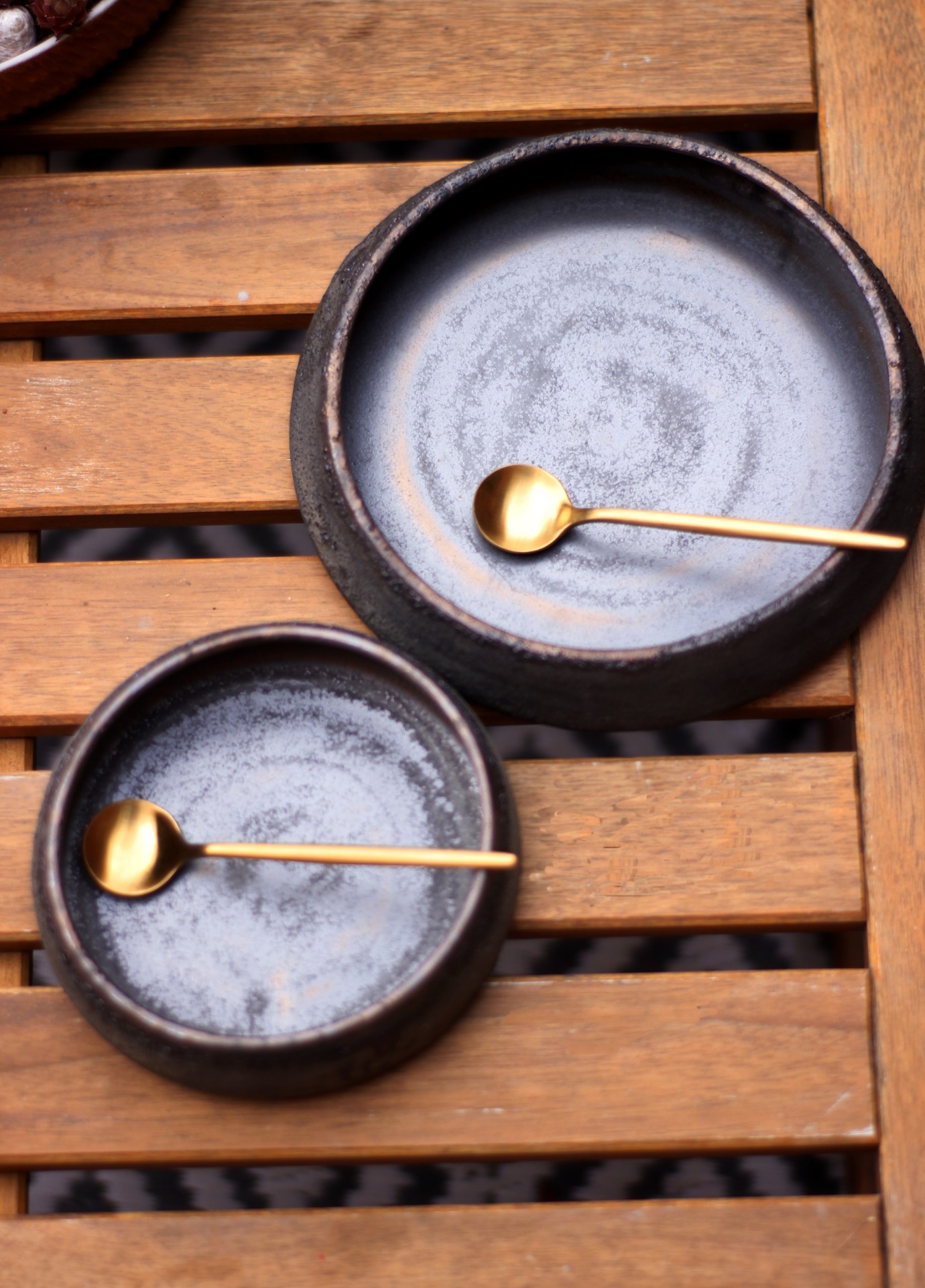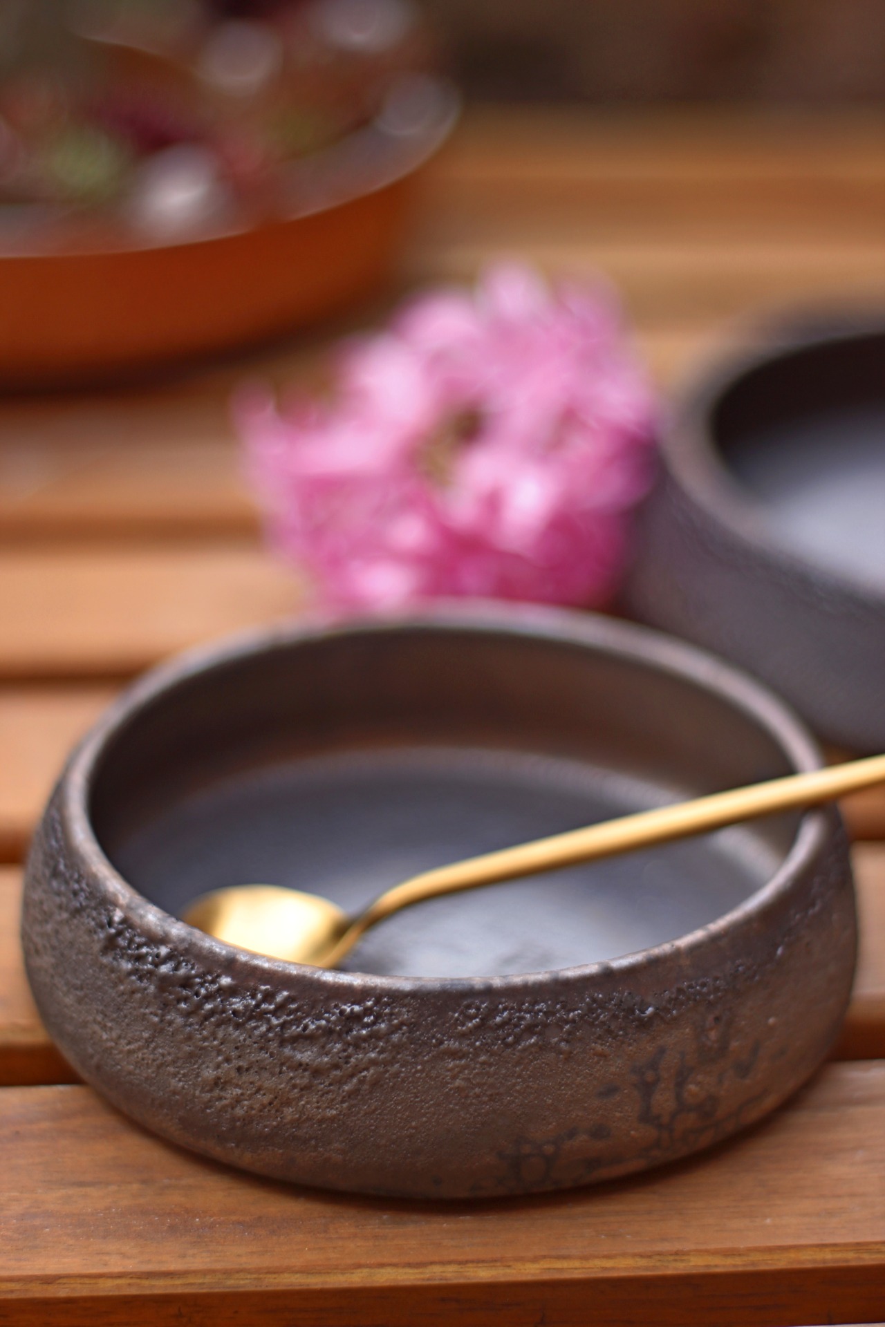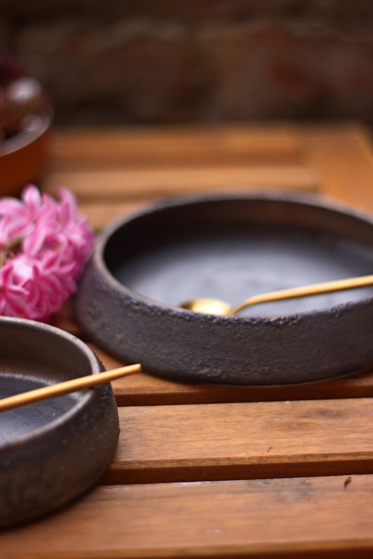 Ručně točené mísky ze světlé hlíny . Páleno na vysokou teplotu. Z venku glazura sopečná.