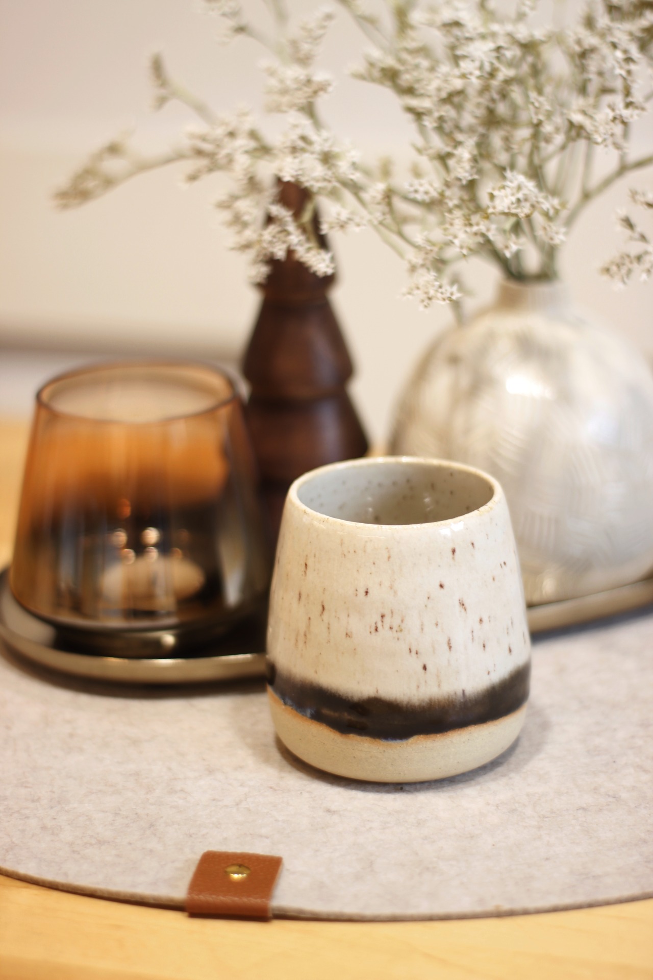 Ručně točená "sklenička" ze světlé hlíny . Páleno na vysokou teplotu. Zvládne sem tam myčku, ale raději má mytí v ruce.