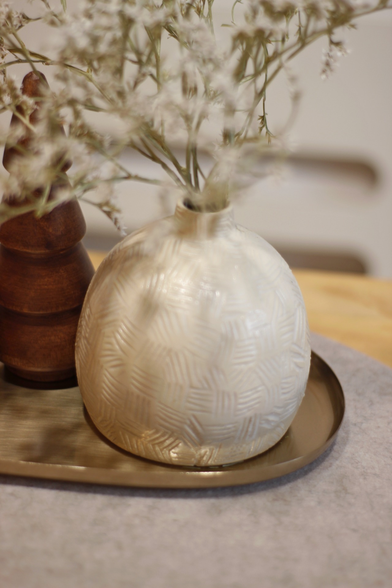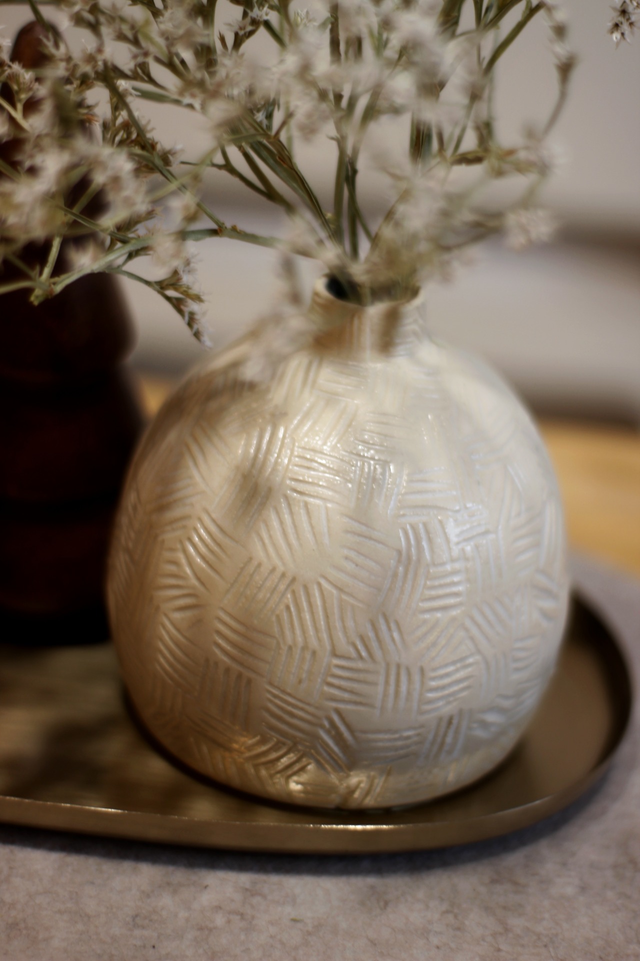 Ručně točená vázička ze světlé hlíny. Páleno na vysokou teplotu. Zvládne sem tam myčku, ale raději má mytí v ruce.
